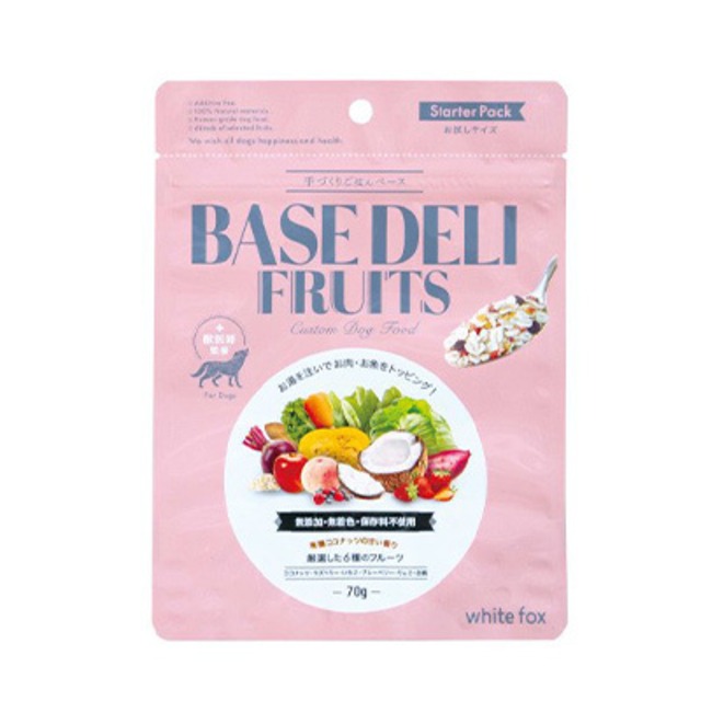 簡単に「うちの子専用ごはん」が作れる BASE DELI FRUITSは簡単に「うちの子専用ごはん」が作れちゃう、とても便利な手作りベースフードです。 使い方はとっても簡単!BASE DELI FRUITSの中にお湯(40~60℃)の入れて混ぜ合わせ、お好みや体調に合わせたお肉やお魚をトッピングするだけ。面倒な栄養バランスの計算や栄養の偏りを心配する必要がありません。お湯を入れてすぐにベースフードが出来上がるので、時間がないときもすぐに手作りごはんを作ることができます。お好みや体調に合わせてオイルなどをトッピングするのもおすすめです。 国産原料100%、獣医師監修の厳選素材 BASE DELI FRUITSで使用している20種類の果物や野菜・穀物はすべて国産原料を使用しています。獣医師監修のもと、さつまいもや大麦フレーク、オートミールなど、無添加・無着色・保存料不使用の厳選した素材を集めました。また腸内環境に配慮した食材(米麹・りんごセラミド(りんご加工品と記載)・ヤーコン)も配合しています。 また、BASE DELI FRUITSの中に入っているいちごは、犬に与える食材として日本ではあまり認知されていませんが、海外では、老化した細胞を減らすフィセチンという成分が豊富な食材として注目を集めています。いちごを始めとする野菜や果物が作る色とりどりの栄養素を生かすためには、犬に無理のない範囲で毎日少量ずつをコツコツと与えていくことがポイント。そのためには、オーナー様が無理なく続けられる「簡単・お手軽さ」はとても大切だと考えています。 ※にんにくは100g中0.4%以下の配合となっておりますが、嗜好性をアップするために獣医師監修のもと配合量を調節しております。 嗜好性抜群!トッピングにも使える BASE DELI FRUITSは食べムラや食の落ちたパートナーにも食べてもらえるように、嗜好性にこだわって作っています。開けた瞬間から広がるココナッツの甘い香りでパートナーの食欲をそそること間違いなし!嗜好性も高いので、いつものフードへのトッピングにもおすすめです。 パートナーの体調や体質に合わせたトッピング事例 パートナーの体調や体質に合わせてトッピングするお肉やお魚、卵、レバー、ハツ、お豆腐といった多種多様なタンパク源をお選びください。 ・肥満が気になる・・・鶏ささみ・鶏むね肉・タラなど ・関節ケア・・・サバ・マグロ・鮭など ・皮膚被毛ケア・・・牛レバー・豚レバー ※年齢や活動量・コンディションに合わせて、量は調節してください。 こんなパートナーにおすすめ ・フードを食べてくれない ・好き嫌いが激しく偏食ぎみ ・シニア期になって今までのフードが合わなくなった ・特定の疾病やアレルギー体質がある 素材・原産国・成分値・カロリー・注意事項 素材 さつまいも、大麦フレーク、オートミール、有機ココナッツ、にんじん、米麹、りんごセラミド、ラズベリー、いちご、ブルーベリー、りんご、白桃、ビーツ、キャベツ、海藻(こんぶ、わかめ)、大麦若葉、ヤーコン、ケール、ほうれん草、かぼちゃ 原産国 日本 成分値 粗タンパク質 7.3%以上、粗脂肪 4.6%以上、粗繊維 4.0%以下、粗灰分 1.9%以下、水分 7.0%以下、リン 0.21%、マグネシウム 0.08%、ナトリウム 0.06% カロリー 328kcal/100g 備考 ■与え方: ①ベースデリに40~60℃ぐらいのお湯を同量~2倍程度かけてすぐにムラなく混ぜ合わせます。1~3分ほどおいてやわらかさを調整します。 ②お好みや体調に合ったお肉・お魚などをトッピングしてください。 ■保存方法: 直射日光の当らない冷暗所で常温保存してください。 ■注意事項: ・本品は愛犬用の一般食です。 ・幼児、小さなお子様の手が届かない所で保管して下さい。 ・同封の脱酸素剤は食べられません。ご注意ください。 ・生後2ヵ月未満のパートナーには与えないでください。 ・フードを変えるとお腹がゆるくなる場合があります。 給与目安の1/3量から始め、様子をみながら徐々に量を増やしてください。 ・お湯を加えて残ったベースデリは冷蔵庫に保管して当日中に与えてください。 ・使用後はチャックをしめて密閉し、水分が入らないようにご注意ください。 ・着色料、香料不使用なので、色や味にバラツキがあります。茶色や黒っぽい粒はさつまいも、海藻、穀物の一部です。 ・粉末原料が含まれているため、使用前は袋をよく振ってください。 ・アレルギーなどの体質に合わせて、かかりつけの獣医師とご相談の上食材をお選びいただくのがおすすめです。