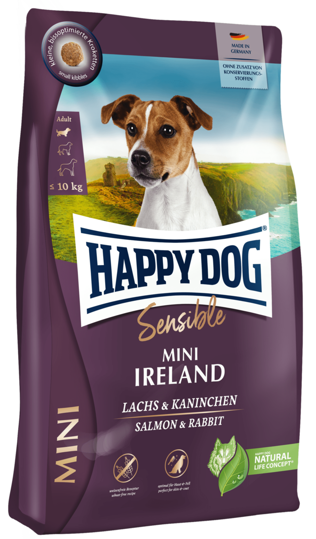 「ミニ アイルランド」は、オメガ3、オメガ6脂肪酸豊富なサーモン、栄養豊富で風味豊かなうさぎ肉、水溶性食物繊維豊富で腸内環境を整えるオーツ麦、大麦などの厳選したナチュラル食材を組み合わせた、健康で艶やかな皮膚と光り輝く被毛のための小型犬用スペシャルレシピです。身体の機能を整える良質な植物オイルや各種ハーブ、関節の健康維持に欠かせない緑イ貝、ビタミン、ミネラルをバランスよく配合しています。排泄物の臭い軽減に配慮して、ユッカシジゲラを配合しました。 HAPPY DOGの「コンプリートフード」は、愛犬の健康な毎日の主食として、給与量目安を参考に給餌することで健康を維持できるよう最適に設計された栄養バランスのフードで、FEDIAF(欧州ペットフード工業連合会)の定める栄養基準を満たしています。一般的に、AAFCO(米国飼料検査官協会)の栄養基準を満たすものを「総合栄養食」と称しますが、HAPPY DOGはドイツ製ですので、FEDIAF(欧州ペットフード工業連合会)の基準を採用しています。 犬や猫が必要とする栄養基準を満たした、毎日の主要な食事として与えるためのフードという意味で「総合栄養食」と同等の表現と言えます。 原材料 オーツ麦、サーモンミール(12.5%)、ラビットプロテイン*(12.5%)、大麦、コーン、ポテト*、油脂類、ポテトプロテイン*、加水分解プロテイン、ビートファイバー*、アップルポマス*、塩化カリウム、サッカロマイセス・セレビシエ*、塩化ナトリウム、炭酸カルシウム、海藻*、ミックスハーブ(ミルクシスル、アーティチョーク、タンポポ、ショウガ、カンバ葉、ネトル、カモミール、コリアンダー、ローズマリー、セージ、リコリス根、タイム:0.16%)、亜麻仁、乾燥全卵、緑イ貝*(0.05%)、ユッカシジゲラ*、イースト抽出物*、ビタミン類(ビタミンA、ビタミンD3、ビタミンE、ビタミンB1、ビタミンB2、ビタミンB6、ビオチン、Dパントテン酸カルシウム、ナイアシン、ビタミンB12、ビタミンC、コリン、葉酸)、ミネラル類(鉄、銅、亜鉛、マンガン、ヨウ素酸カルシウム、亜セレン酸ナトリウム)、天然由来トコフェロール(酸化防止剤として)(*乾燥) 成分 粗タンパク質 24.0 % 粗脂肪 12.0 % 粗繊維 3.0 % 粗灰分 7.0 % 粗炭水化物 45.0 % 水分 9 % オメガ6脂肪酸 2.50 % オメガ3脂肪酸 0.30 % 代謝エネルギー:361.0kcal/100g ミネラル カルシウム 1.00 % リン 0.85 % カリウム 0.75 % ナトリウム 0.55 % マグネシウム 0.14 % 鉄 50 mg 銅 10 mg マンガン 25 mg 亜鉛 100 mg ヨウ素 2.00 mg セレン 0.10 mg ビタミン /kg ビタミンA 17000 I.U. ビタミンD3 900 I.U. ビタミンE 120 mg ビタミンB1 4 mg ビタミンB2 4 mg D-パントテン酸カルシウム 10 mg ナイアシン 50 mg ビタミンB6 4 mg ビタミンB12 70 mcg ビオチン 490 mcg コリン 55 mg ビタミンC 30 mg 葉酸 3 mg