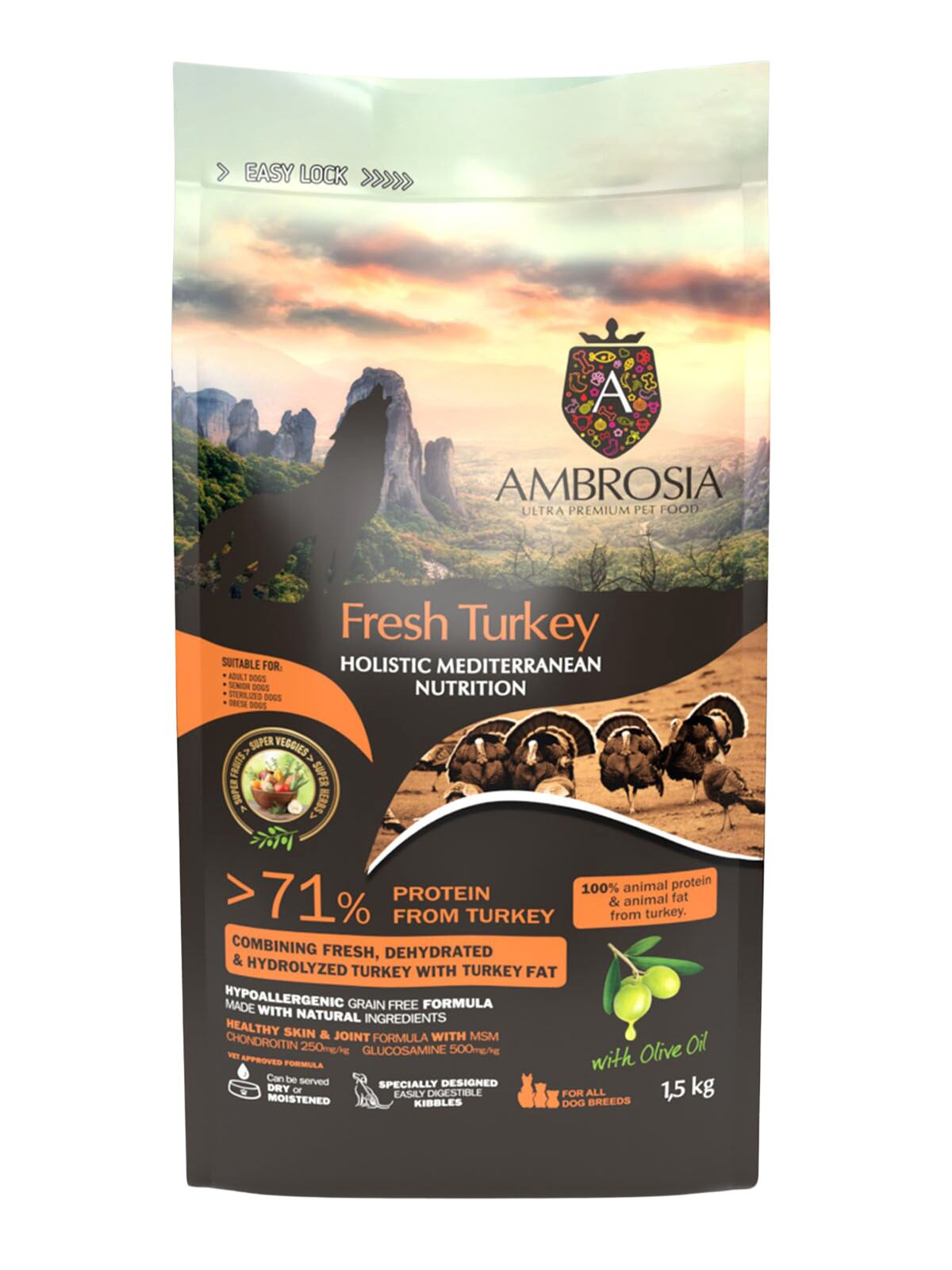 ターキー(30%)、サツマイモ、ドライターキータンパク(14%)、エンドウ豆、ターキーの脂肪(4%)、加水分解されたターキータンパク(3%)、ドライルツェルン、ビートパルプ、ドライチコリ(イヌリンとフルクトオリゴ糖の供給源として;1%)、オリーブオイル(0.5%)、亜麻仁、塩化コリン、MSM(メチルスルホニルメタン;0.15%)、タウリン、塩酸グルコサミン(500mg/kg)、コンドロイチン硫酸塩(250mg/kg)、ドライアップル、ドライトマト、フェヌグリーク、ドライ梨、ドライオレンジ、オレガノ、タイム、プロバイオティクス(エンテロコッカス・フェシウム)、ビタミンE(一部保存料として)、ビタミンC、亜鉛、鉄、マンガン、ビタミンB12、ビオチン、ナイアシン、パントテン酸、ビタミンA、ビタミンB2、銅、ビタミンB1、ビタミンB6、ヨウ素、葉酸、セレン、ビタミンD3