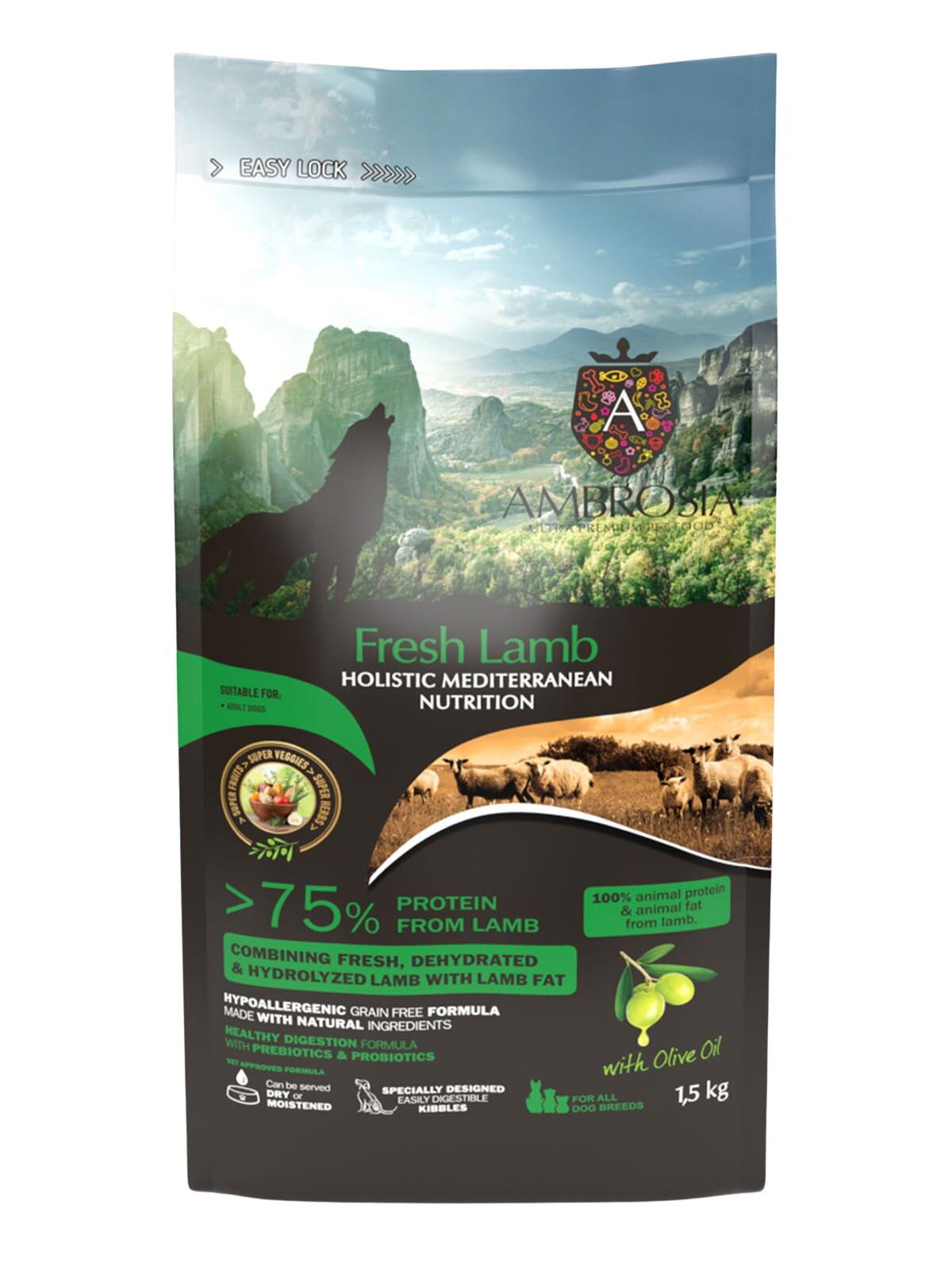 ム肉(30%)、ドライラムタンパク(22%)、サツマイモ、エンドウ豆、ラムの脂肪(5%)、加水分解されたラムタンパク(3%)、ドライルツェルン、ビートパルプ、ドライチコリ(イヌリンとフルクトオリゴ糖の供給源として;1%)、オリーブオイル(0.5%)、亜麻仁、塩化コリン、マンナンオリゴ糖(0.15%)、タウリン、ドライアップル、ドライトマト、フェヌグリーク、ドライ梨、ドライオレンジ、オレガノ、タイム、プロバイオティクス(エンテロコッカス・フェシウム)、ビタミンE(一部保存料として)、ビタミンC、亜鉛、鉄、マンガン、ビタミンB12、ビオチン、ナイアシン、パントテン酸、ビタミンA、ビタミンB2、銅、ビタミンB1、ビタミンB6、ヨウ素、葉酸、セレン、ビタミンD3