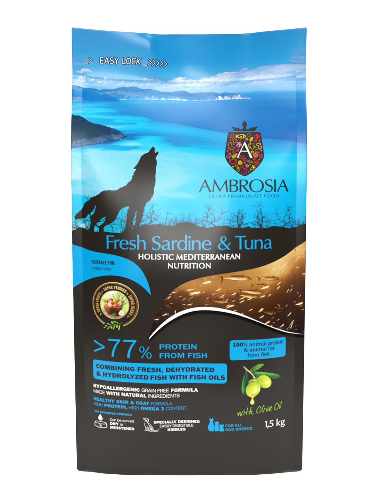 イワシ(30%)、ドライツナタンパク(20%)、サツマイモ、エンドウ豆、サーモンオイル(5%)、加水分解されたサーモンタンパク(3%)、ビートパルプ、ココナッツオイル(3%)、オリーブオイル(0.5%)、ドライルツェルン、ドライチコリ(イヌリンとフルクトオリゴ糖の供給源として;0.5%)、亜麻仁、塩化コリン、マンナンオリゴ糖(0.15%)、タウリン、ドライアップル、ドライトマト、フェヌグリーク、ドライ梨、ドライオレンジ、オレガノ、タイム、プロバイオティクス(エンテロコッカス・フェシウム)、ビタミンE(一部保存料として)、ビタミンC、鉄、亜鉛、ビタミンB12、ビオチン、ナイアシン、パントテン酸、ビタミンA、ビタミンB2、銅、マンガン、ビタミンB1、ビタミンB6、ヨウ素、葉酸