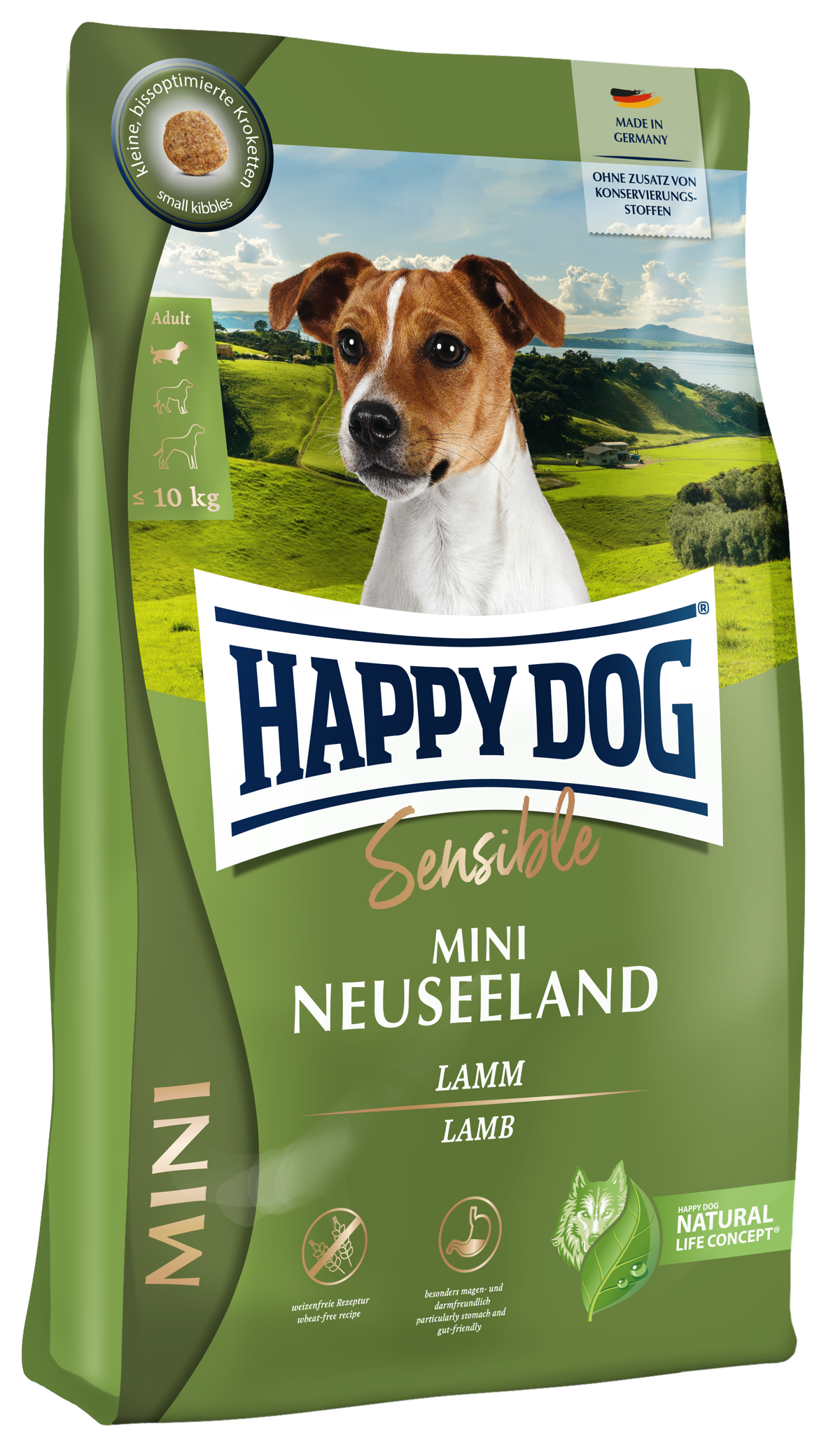「ミニ ニュージーランド」は、必須アミノ酸豊富で、高タンパク、低カロリー、栄養豊富でおなかに優しいラム肉に、消化に良い米、身体の機能を健康に保つ植物オイルや各種ハーブなど、おなかに優しい原材料を厳選した、おなかの弱い愛犬や、便の調子を整えたい愛犬におすすめの消化器ケアスペシャルレシピです。関節の健康維持に緑イ貝を配合しています。使用している動物性タンパク質はラム肉のみです。